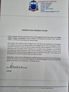 “Meanwhile, I wish to call on all Christians in Sokoto and around to remain calm and to please pray for the repose of the soul of Ms. Deborah. It is the first obligation we owe her.