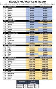 A statistic, tagged “Religion and Politics in Nigeria”, showing states being governed by Christians and Muslims is trending on the social media, following the raging controversy trailing the Muslim-Muslim Presidential ticket of the ruling All Progressives Congress (APC).