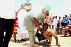 Mutfwang in a warm handshake with a physically challenged member of the stakeholders.