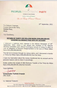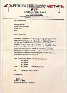The letter dated Thursday September 29, reads, “My attention has been drawn to a damaging trending story reported in THE NATION Newspaper by Yusuf Alli on September 26, 2022 titled “Disquiet in PDP NWC over N10 billion nomination fees.”