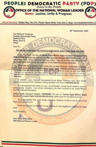 “I hereby inform you of the refund of the Sum of Twenty Eight Million Eight Hundred Thousand naira (#28,800,000:00) back to the Peoples Democratic Party, Account Number: 1000095003 at Globus Bank PLC. The receipt of the payment back to the account is attached.”
