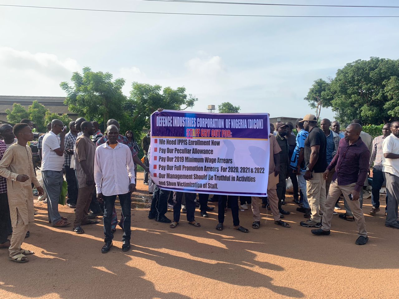 Civilian staff of the Defence Industry Corporation of Nigeria (DICON), Kaduna, have accused the management of the corporation for allegedly ordering soldiers to beat them during a peaceful protest to demand for the non payment of their allowances.