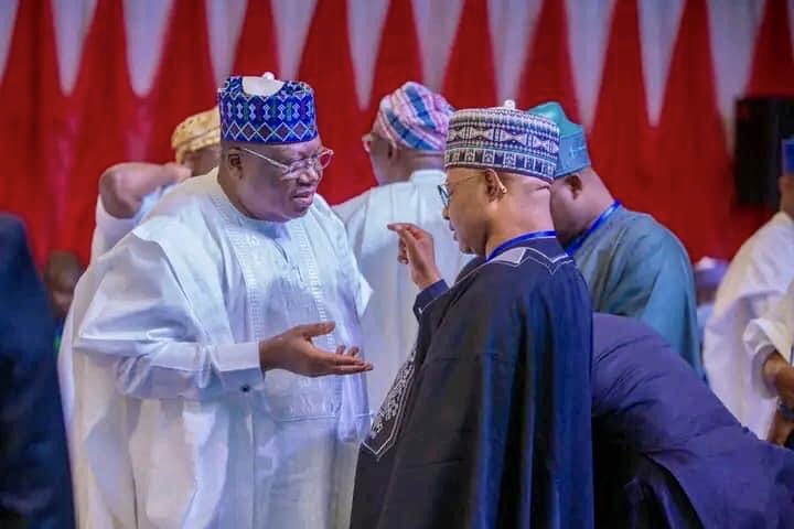 Governor Uba Sani, in a handshake with his Kogi counterpart, Yahaya Bello