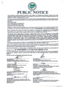 It further stated that “the notice serves as a disclaimer of further usage of the name Christian Association of Nigeria, Northern CAN, or Southern CAN.”