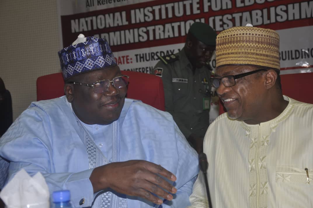 L-R: Senate President Ahmed Lawan, Chairman Senate Committee on Basic and Secondary Education, Sen. Ibrahim Gaidam at the opening of a one day public hearing on the bill on the establishment of National Institute for Educational Planning and Administration on Thursday at the National Assembly, Abuja. Photo by Sylvanus Tyoakaa