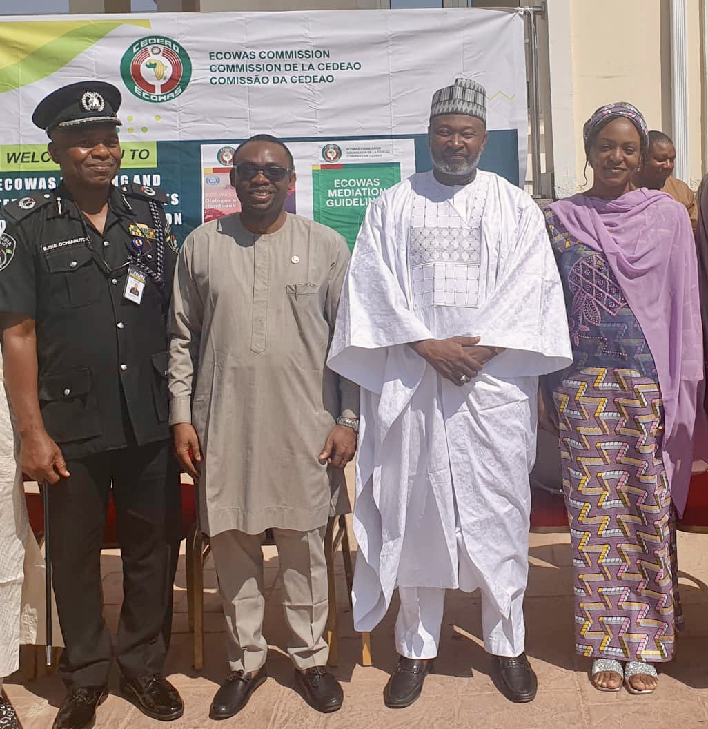 L-r: Representative of Plateau State Commissioner of Police, ACP Ejike Ochiabuto; ECOWAS Commission Programme Officer on Mediation, Dr. Brown Odigie; National Secretary , Inter-Party Advisory Council (IPAC), Alh. Yusuf Dantalle and Political Affairs Officer, UNOWAS, Ms. Sa’adatu Shuaibu, at the ECOWAS Mediation and Dialogue Training with IPAC and Stakeholders on Non-Violent 2023 Elections on Tuesday…